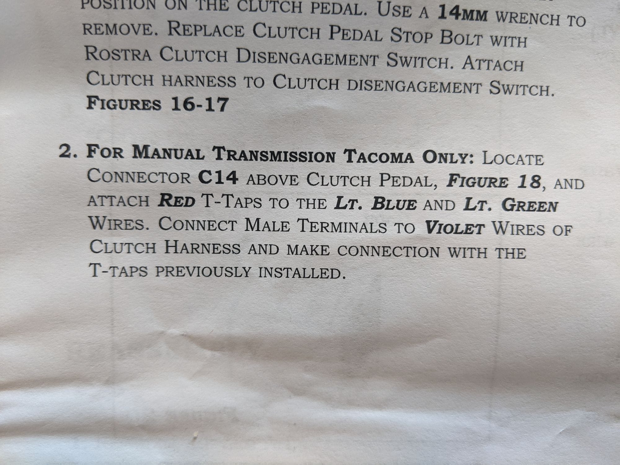 Although wiring the clutch disengagement switch to the cruise control clutch connector was difficult, again due to the confined space, I had greater frustration with the instructions provided by Rostra for performing the connection – there were two separate cruise control kit manuals for the Tacoma that had different wiring instructions, and the manual that came with the clutch disengagement switch showed a non-legible diagram that pointed somewhere under the dashboard, along with schematic diagrams that don't really relate to what you see under the dashboard. The key elements for finding the correct connector was found in one of the cruise control kit manuals (Fig 4). It clearly stated to look for the light green and light blue wires in the connector (Fig 3), and this diagram I found online that pointed to C16 (the Cruise Control Clutch Switch), gave me enough information to look in the right area. I also read an online comment about carefully cutting the connector out of the taped harness to better expose it, and this was evident in the connector that I saw.