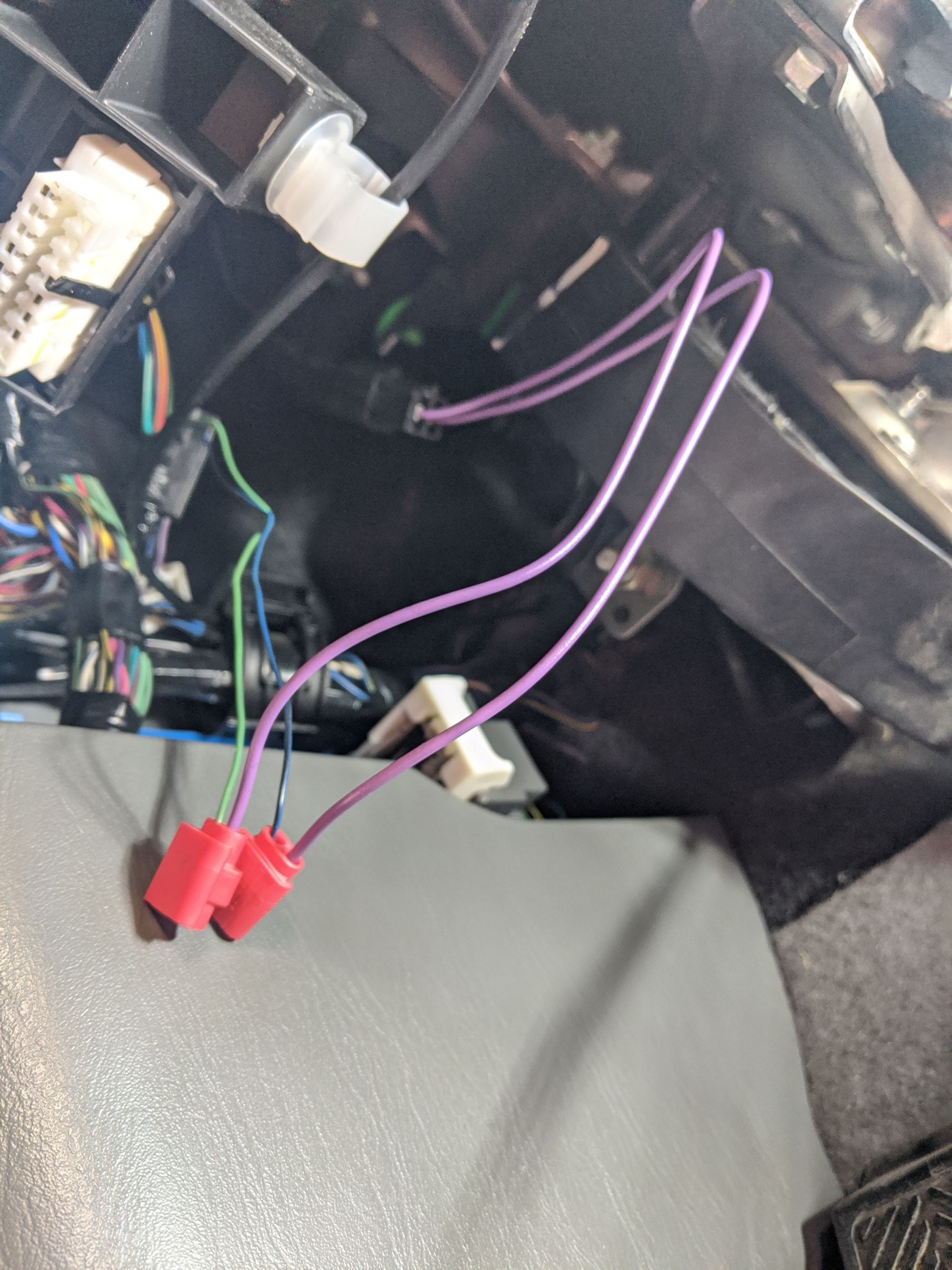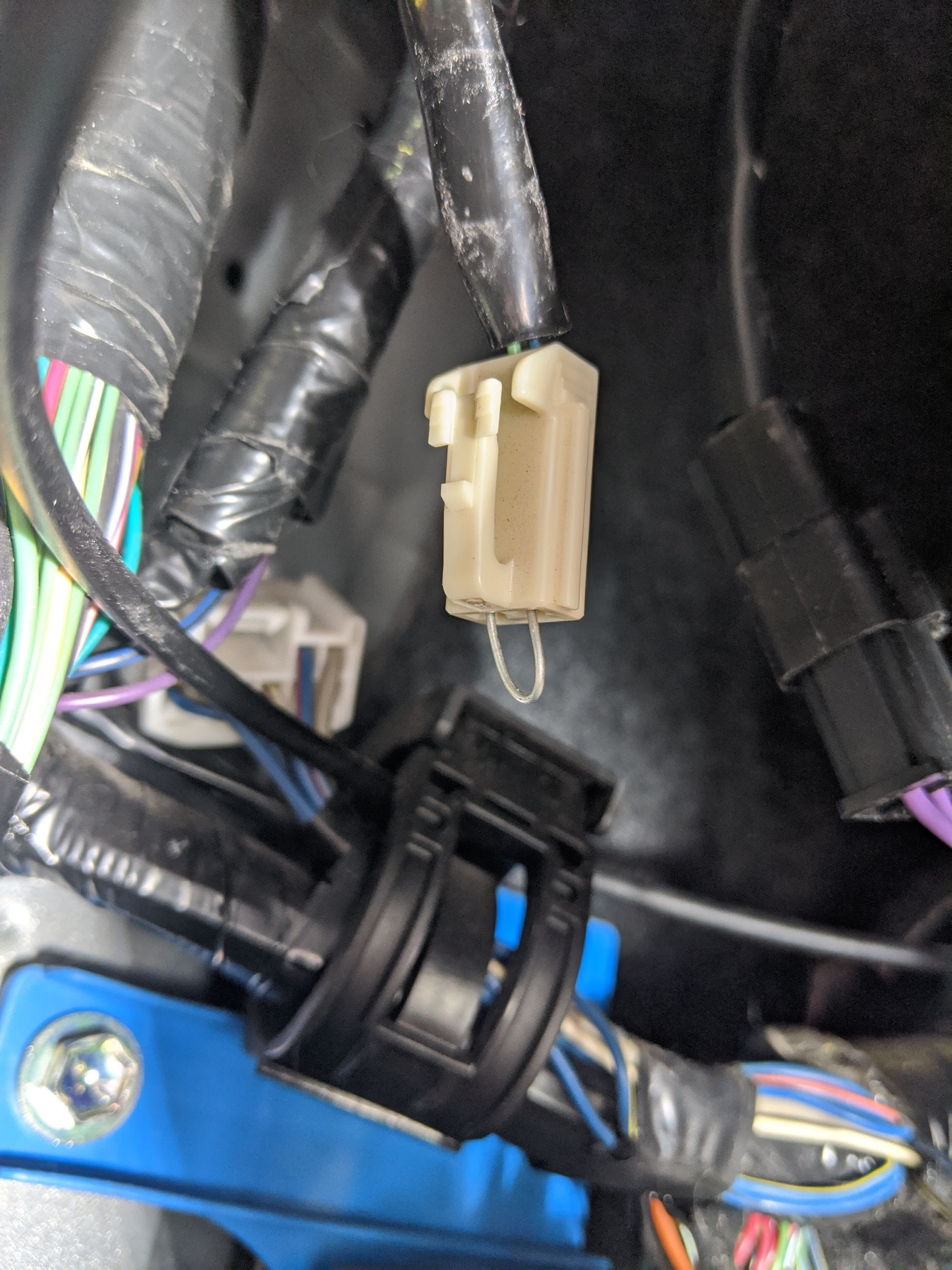 All of these tips gave me the confidence to test the connector by jumping the circuit (closing the circuit) with a simple loop-back wire. To do so, I first cut the tape holding the connector to the main harness and then continued to untaped it enough to pull it down further so that I could more easily insert the loop-back wire (Fig 5). Prior to this, I tested the clutch disengagement switch with a circuit tester to determine the circuit state when the switch was depressed: it showed that when the clutch is engaged (pedal-up) and the switch is depressed, the circuit is closed, so I assumed that by jumping the connector's circuit, it would simulate an engaged clutch. Sure enough, on a quick roadway test, the cruise control operated as expected. So, this also demonstrated that you could simply by-pass the clutch disengagement switch by jumping the cruise control clutch connector. I do not recommend this. On the roadway test, I depressed the clutch pedal to disengage the clutch and the cruise control module revved the engine more than I expected, which scared the crap out of me. With an operational cruise control confirmed, I further untaped the wires