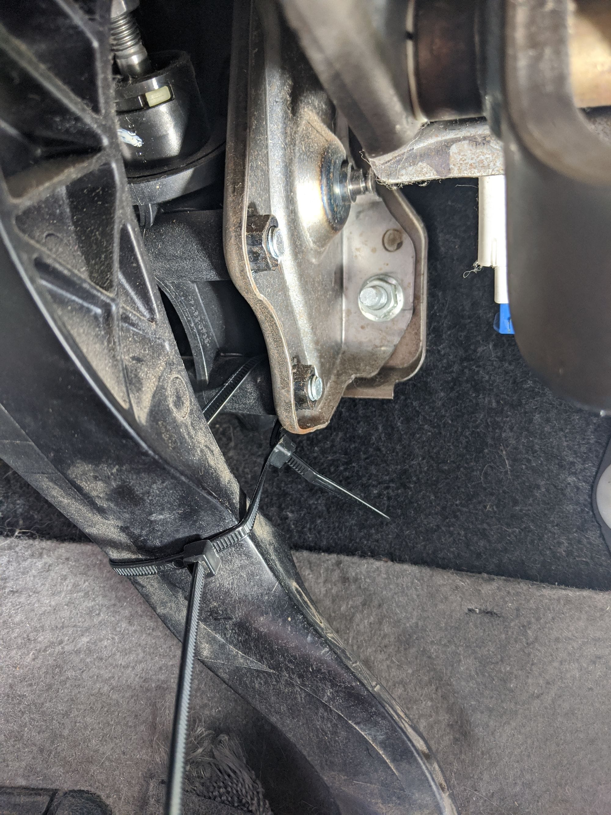 threaded bolt that is a direct replacement for the OEM clutch stop bolt (as outlined in the instructions; some web-based comments noted that the clutch disengagement switch threads did not match those of the stop bolt mounting bracket nut). Although the Rostra instructions for installing this switch are pretty accurate, they fail to describe the difficulty of accessing the stop bolt mounting bracket, which is located above and on the left-side of the clutch pedal. In my case, I could only use one hand to manipulate any operation in the bracket area. Before attempting to replace the stop bolt with the clutch disengagement switch, move the clutch pedal forward and secure it using cable ties (Fig 2). Once the